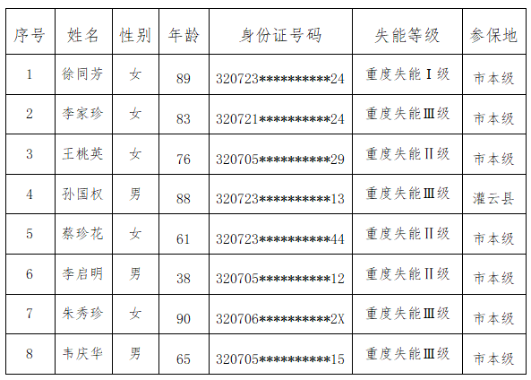 根据《市政府关于建立长期护理保险制度的意见》(连政发〔2023〕26号)、《连云港市职工长期护理保险实施细则(试行)》(连医保〔2023〕44号)文件精神,按照国家医保局《长期护理失能等级评估标准(试行)》(医保办发〔2021〕37号),经评估机构评估,现将本次连云港市长期护理保险失能等级评估的结论公示如下: