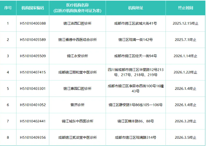 成都市锦江区解除医保服务协议定点医药机构名单