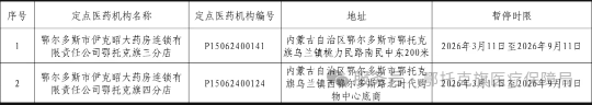 2.鄂尔多斯市伊克昭大药房连锁有限责任公司鄂托克旗四分店,发现存在未按规定使用人脸识别、部分药品入库时未上传追溯码、监控视频储存不足六个月的问题,根据《鄂尔多斯市医疗保障定点零售药店服务协议》(2025版)第十七条、第五十六条第六款、第十款,暂停医保支付,限期整改六个月。