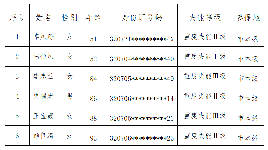 根据《市政府关于建立长期护理保险制度的意见》(连政发〔2023〕26号)、《连云港市职工长期护理保险实施细则(试行)》(连医保〔2023〕44号)文件精神,按照国家医保局《长期护理失能等级评估标准(试行)》(医保办发〔2021〕37号),经评估机构评估,现将本次连云港市长期护理保险失能等级评估的结论公示如下: