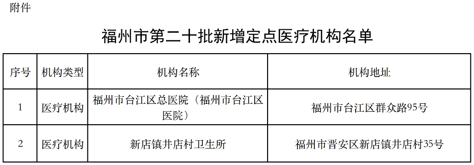 根据《医疗机构医疗保障定点管理暂行办法》(国家医疗保障局令 第2号)、《福州市医疗保障局转发<福建省医疗保障局关于印发医疗保障定点医药机构评估细则的通知>的通知》及《福州市医疗保障基金中心关于恢复受理部分医疗机构申请医保定点协议管理业务的公告》,经申请对象提交材料、材料初审、现场评估、专家评估、协商谈判、公示等程序后,现将符合条件的福州市台江区总医院(福州市台江区医院)等2家医疗机构新增为福州市医保定点单位,并同步纳入异地联网定点范围。