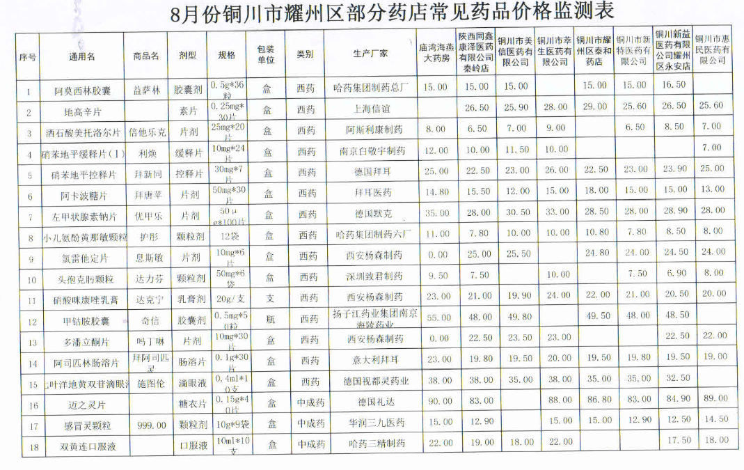 【铜川】8月份铜川市耀州区部分药店常见药品价格监测表