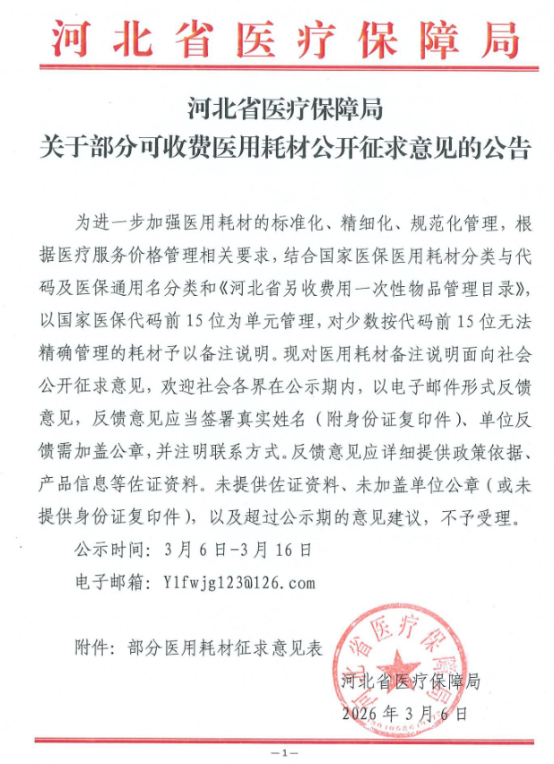 【张家口】转发河北省医疗保障局关于部分可收费医用耗材公开征求意见的公告