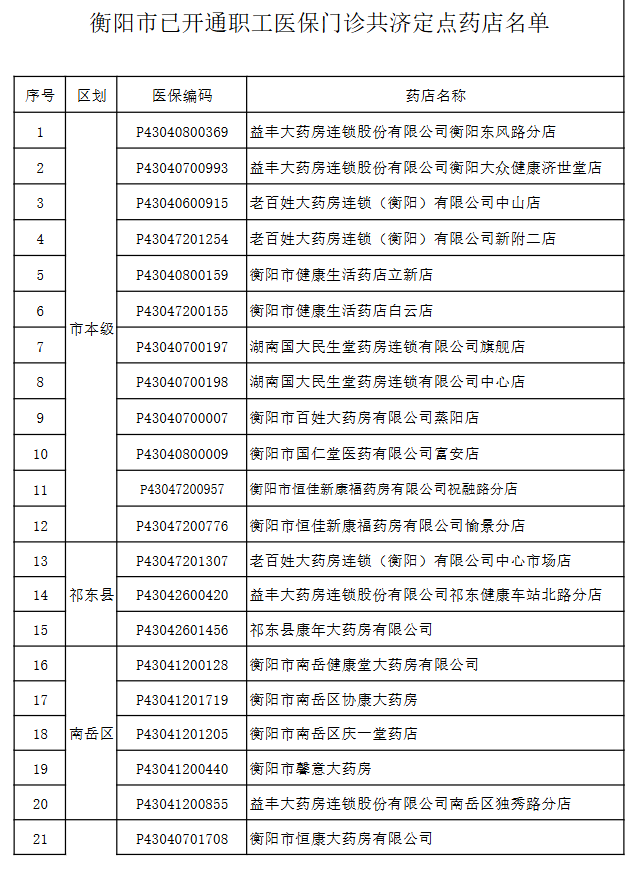 【衡阳】衡阳市已开通职工医保门诊共济定点药店名单