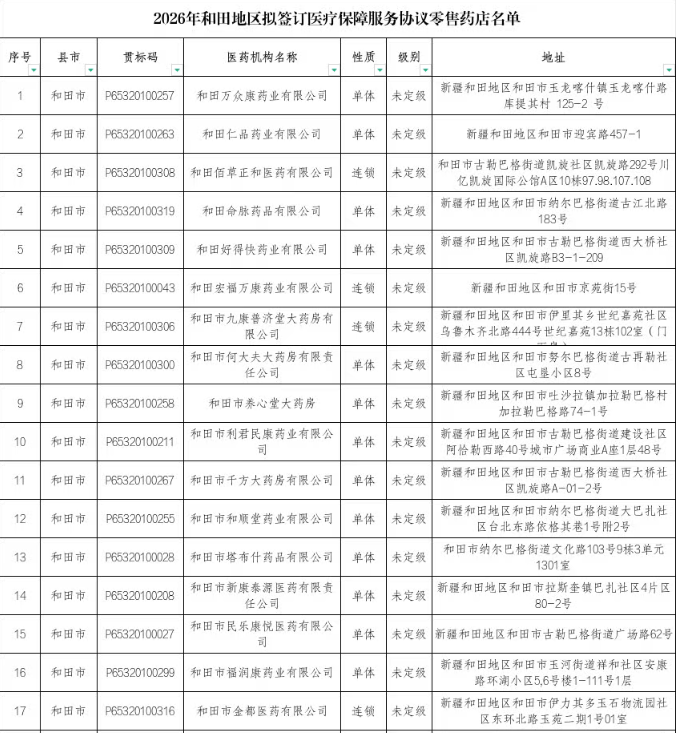 【和田】2026年拟签订医疗保障服务协议零售药店名单公示
