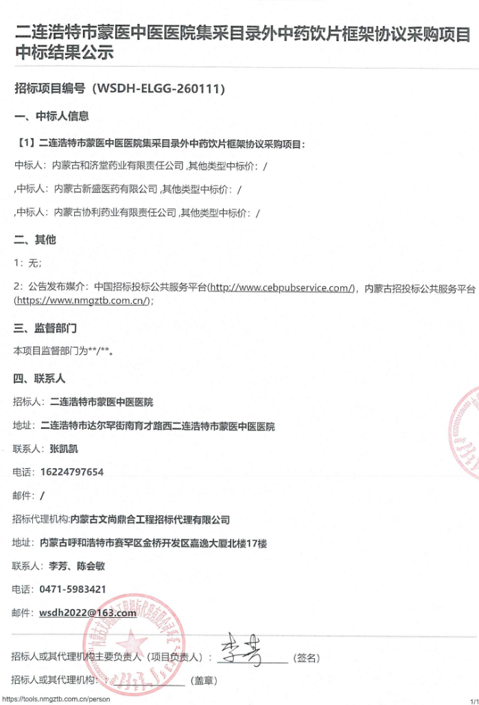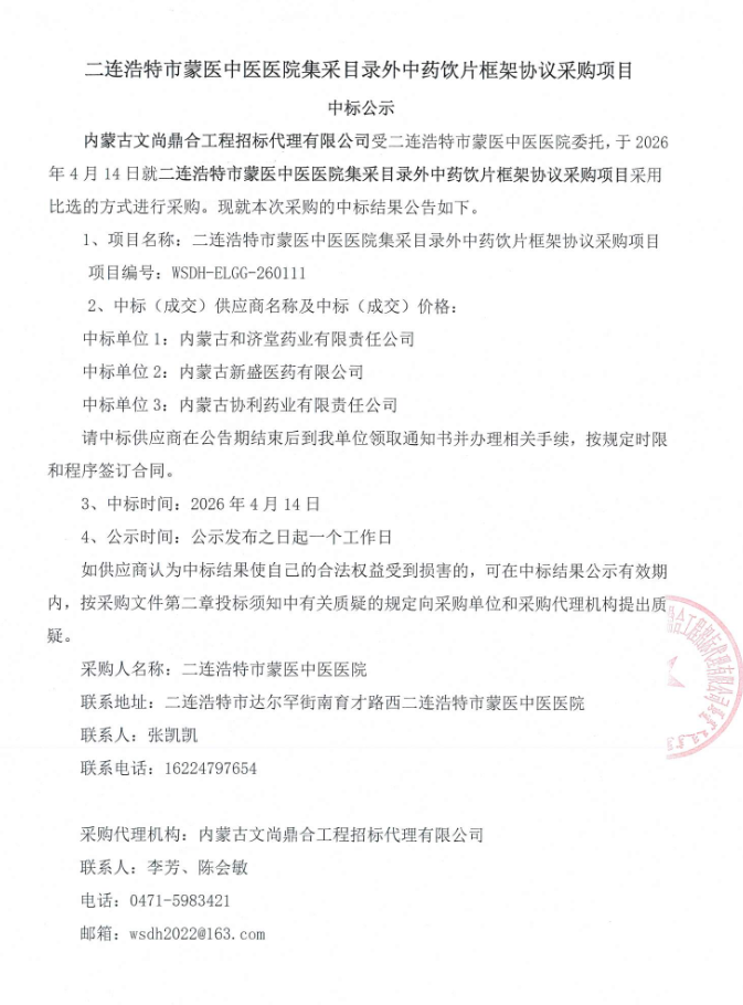 内蒙古自治区二连浩特市蒙医中医医院集采目录外中药饮片框架协议采购项目中标结果公示