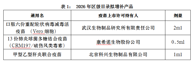 为贯彻实施《中华人民共和国疫苗管理法》和《预防接种工作规范》等法规文件要求,根据上海药品集团采购(GPO)服务网公布的2025年度上海市非免疫规划疫苗集团采购中选产品目录及《青浦区卫生健康委非免疫规划疫苗遴选管理办法》,保障疫苗稳定供应,满足市民接种需求,有3个产品作为区级目录拟增补产品,见表1。