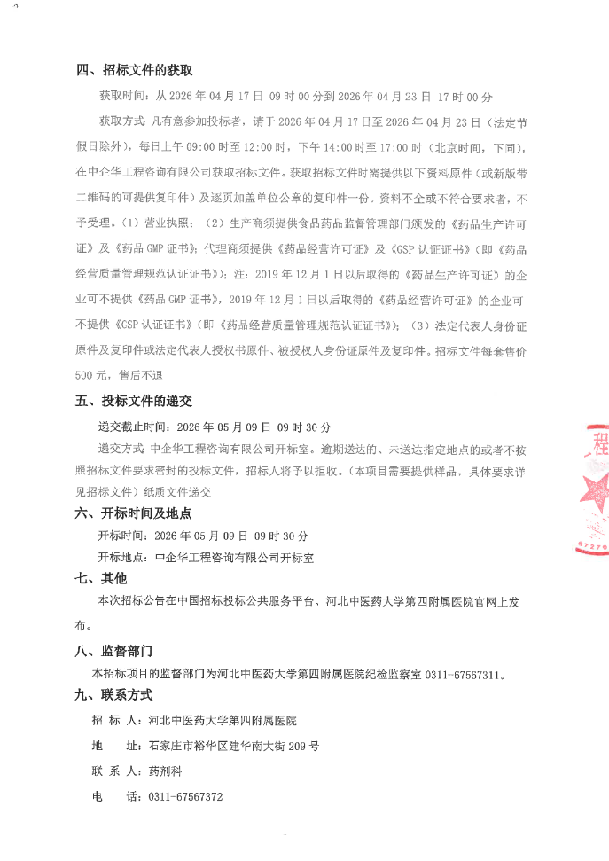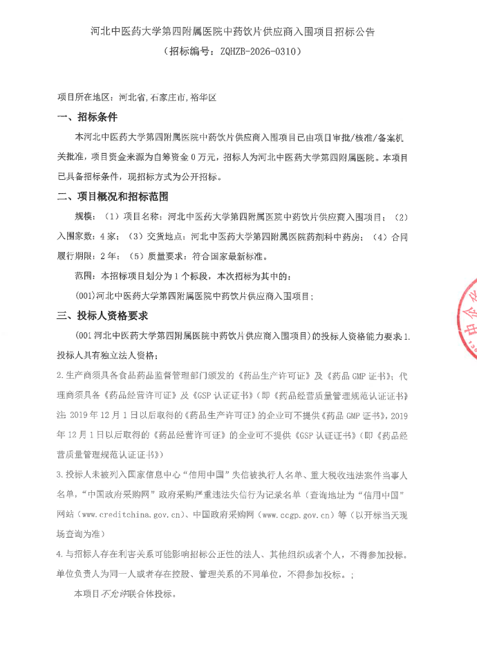 河北中医药大学第四附属医院中药饮片供应商入围项目招标公告