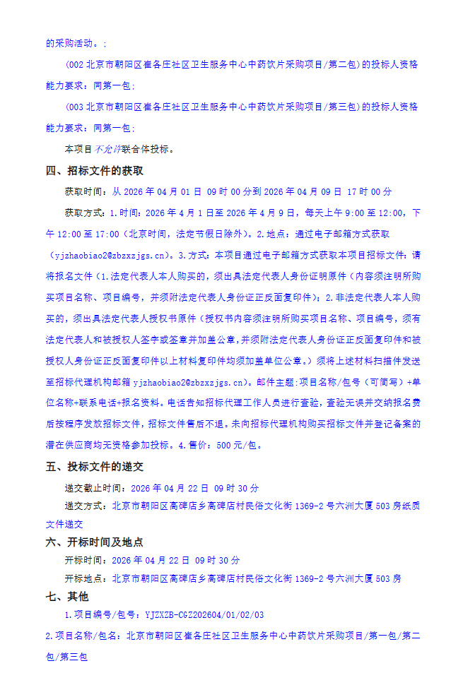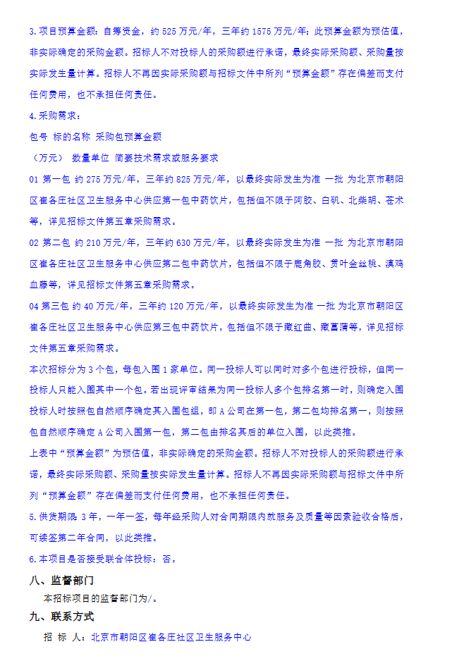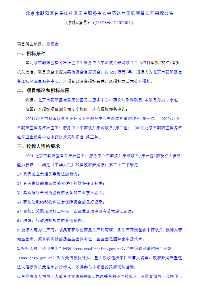 北京市朝阳区崔各庄社区卫生服务中心中药饮片采购项目公开招标公告