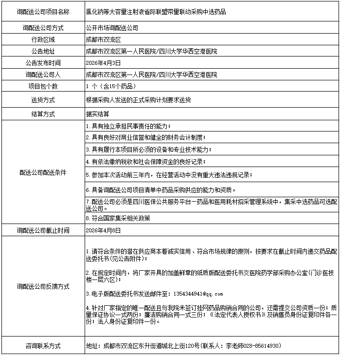 四川省成都市双流区第一人民医院关于氯化钠等大容量注射液省际联盟带量联动采购中选药品的询配送公司公告