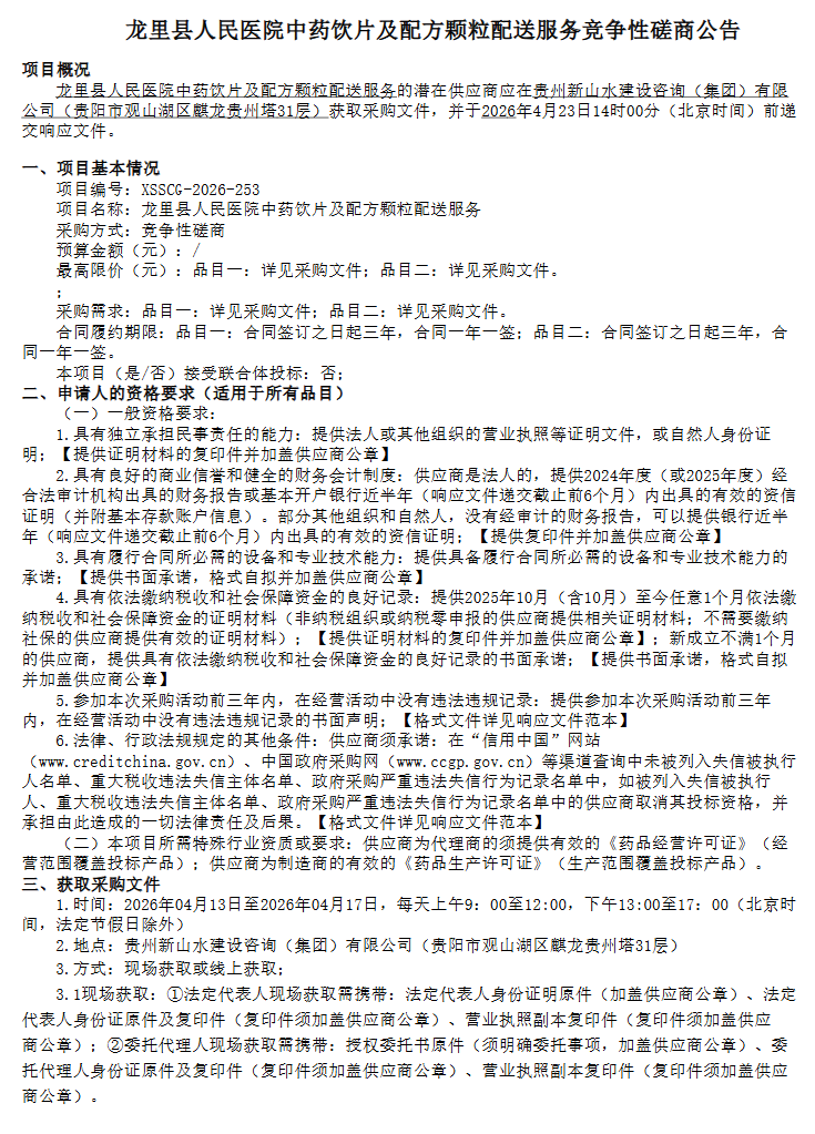 贵州省黔南布依族苗族自治州龙里县人民医院中药饮片及配方颗粒配送服务竞争性磋商公告