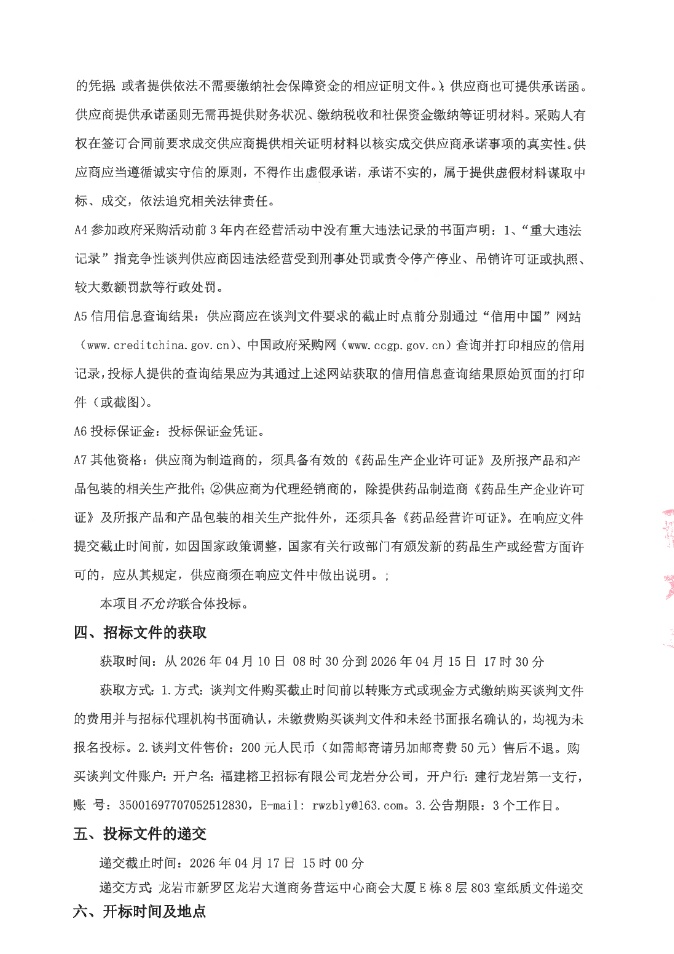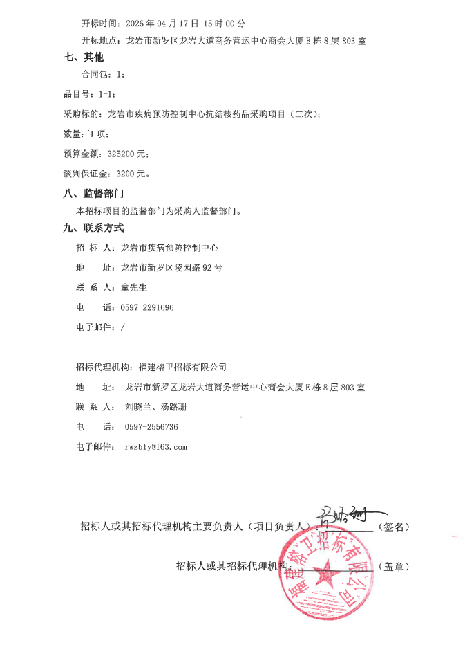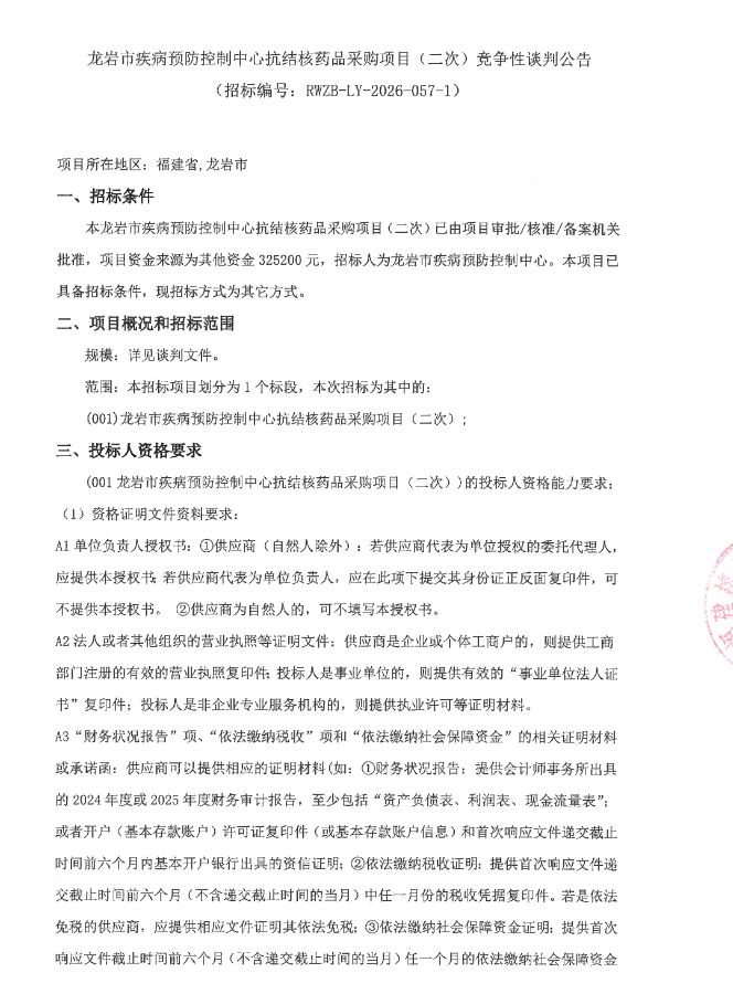福建省龙岩市疾病预防控制中心抗结核药品采购项目(二次)竞争性谈判公告