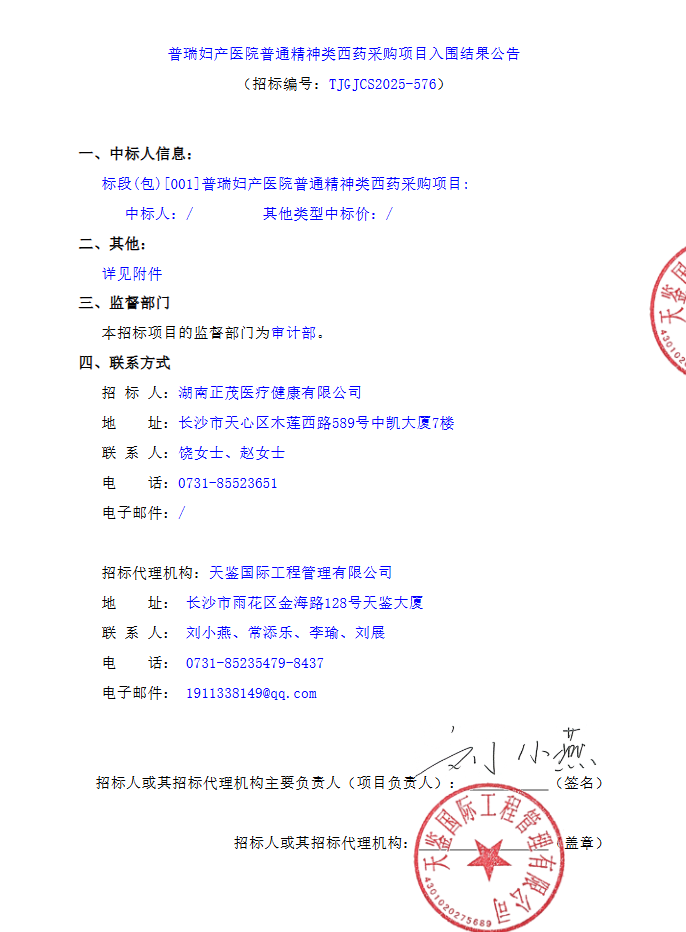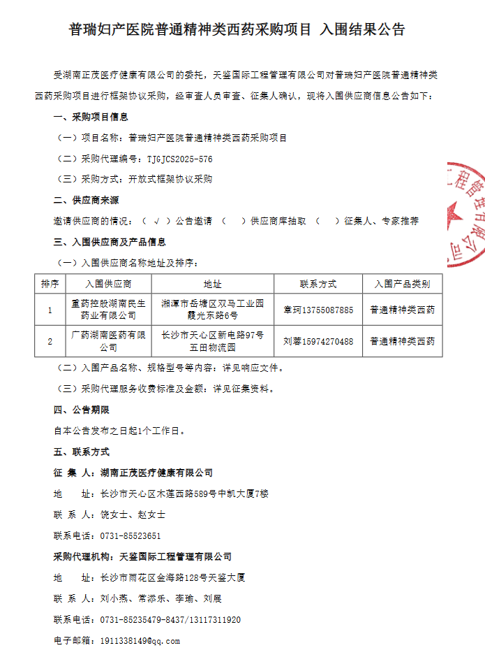 湖南省普瑞妇产医院普通精神类西药采购项目入围结果公告