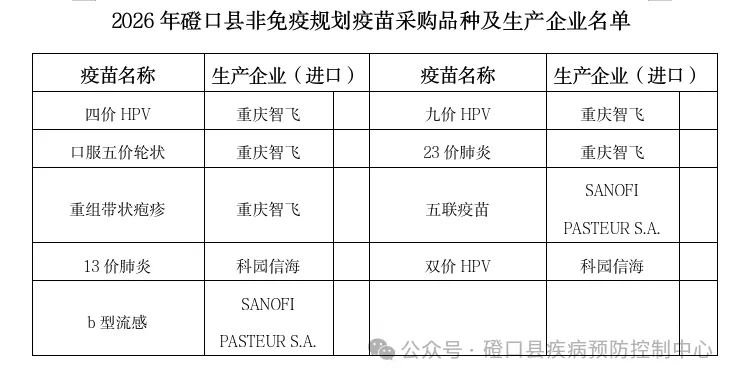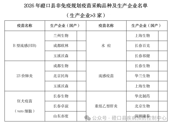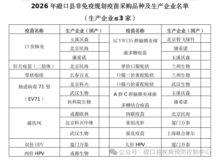 为进一步规范我县非免疫规划疫苗采购管理,保障非免疫规划疫苗供应和预防接种安全,按照《关于进一步加强非免疫规划疫苗采购管理工作的通知》有关规定,4月15日磴口县召开2026年非免疫规划疫苗采购会议,会议通过非免疫规划疫苗采购领导小组集体讨论、科学评估、集体决策,公开、公平、公正的原则,从《内蒙古自治区非免疫规划疫苗网上招采平台》集中挂网的“非免疫规划疫苗采购目录”范围内,确定出2026年磴口县非免疫规划疫苗采购品种及生产企业,现公示如下: