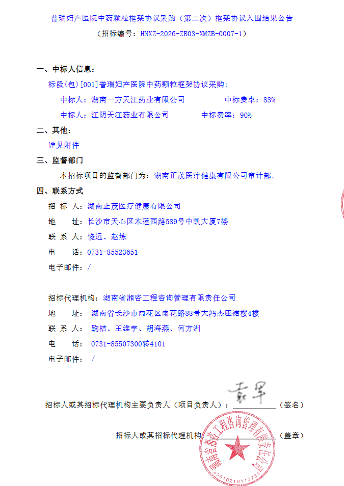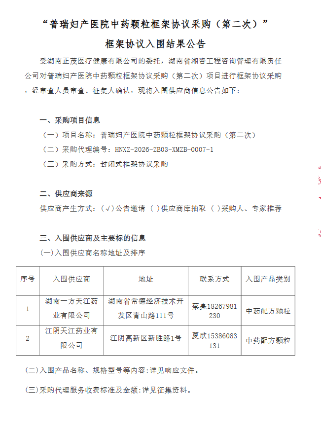湖南省普瑞妇产医院中药颗粒框架协议采购(第二次)框架协议入围结果公告