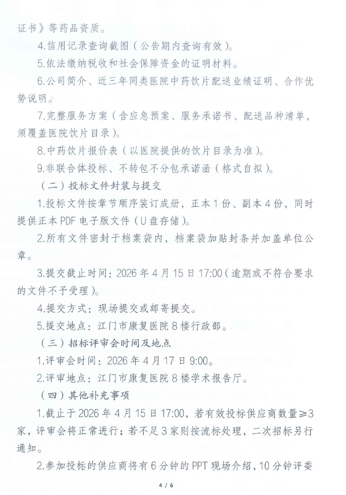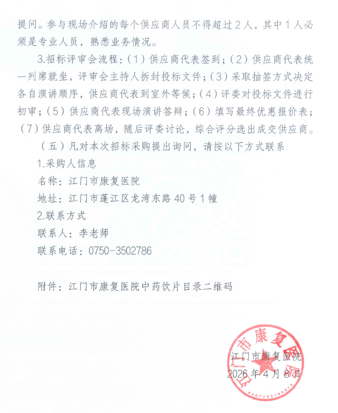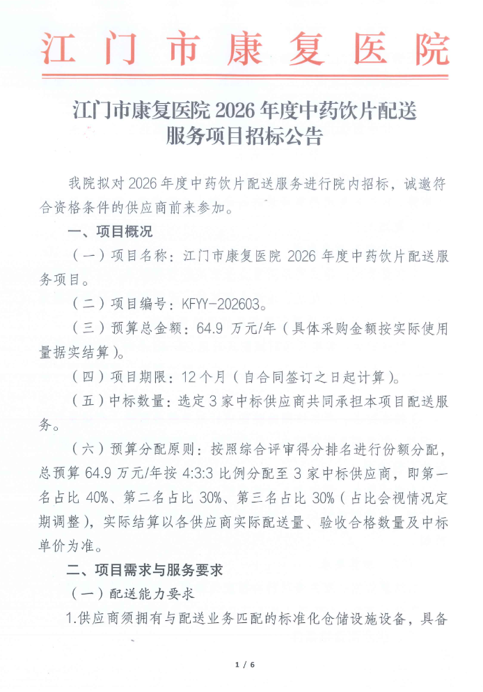 广东省江门市康复医院2026年度中药饮片配送服务项目招标公告