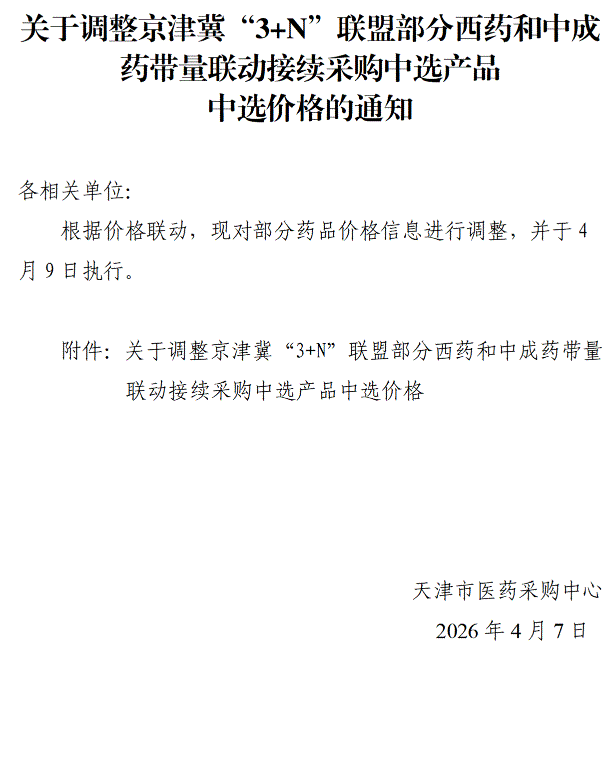关于调整京津冀“3+N”联盟部分西药和中成药带量联动接续采购中选产品中选价格的通知