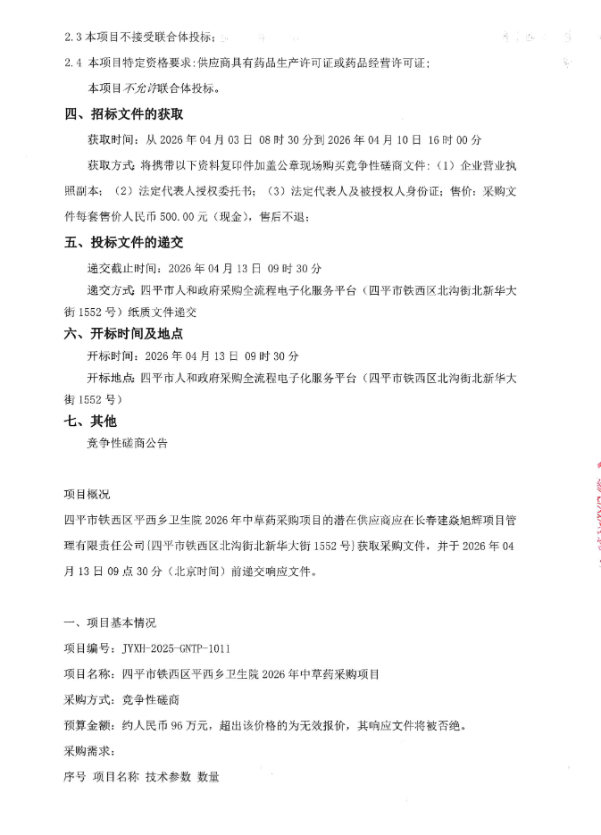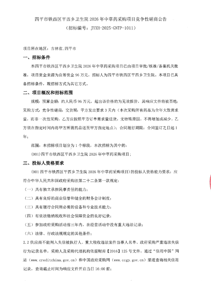 吉林省四平市铁西区平西乡卫生院2026年中草药采购项目竞争性磋商公告