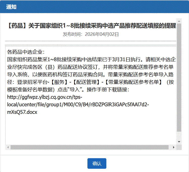 国家组织药品集采1~8批接续采购中选结果已于3月31日执行。请相关中选企业尽快完成各区(县)药品配送协议签订,并将带量采购配送推荐参考名单导入系统,以便医药机构签订药品采购合同。带量采购配送参考名单导入路径:登录招采平台-【服务】-【配送管理】-【带量采购配送参考名单】(按模板准备好名单数据)点击"导入"。操作手册下载链接: http://ggfwpz.ylbzj.cq.gov.cn/tps-local/ucenter/file/group1/M00/C9/B4/rBDZPGlR3iGAPc5fAAl7d2-mXsQ57.docx