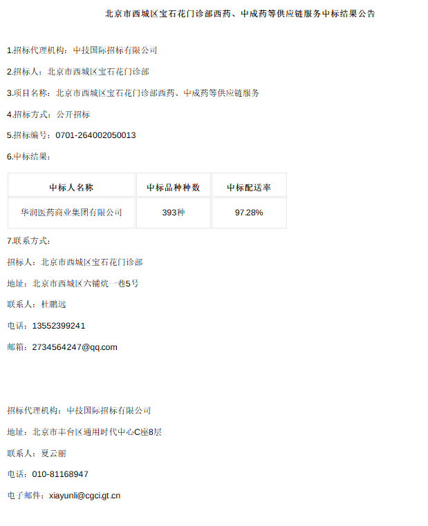 北京市西城区宝石花门诊部西药、中成药等供应链服务中标结果公告