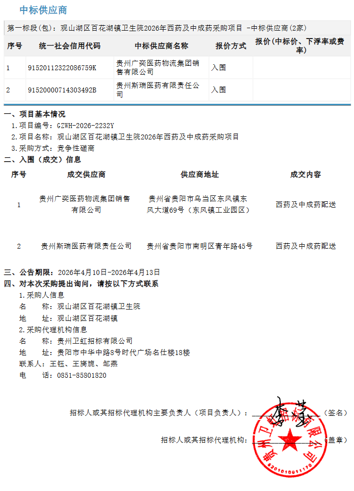 贵州省贵阳市观山湖区百花湖镇卫生院2026年西药及中成药采购项目成交公告