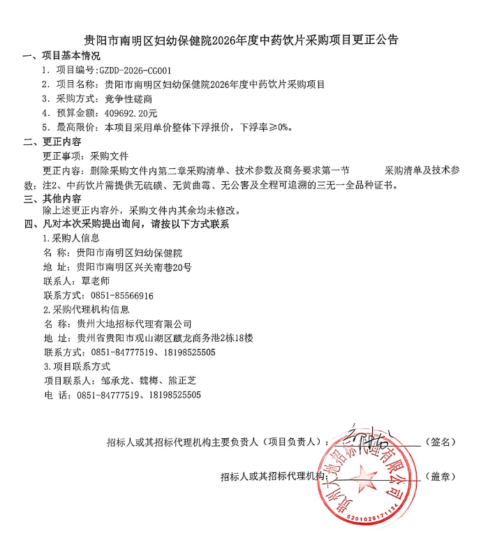 贵州省贵阳市南明区妇幼保健院2026年度中药饮片采购项目更正公告