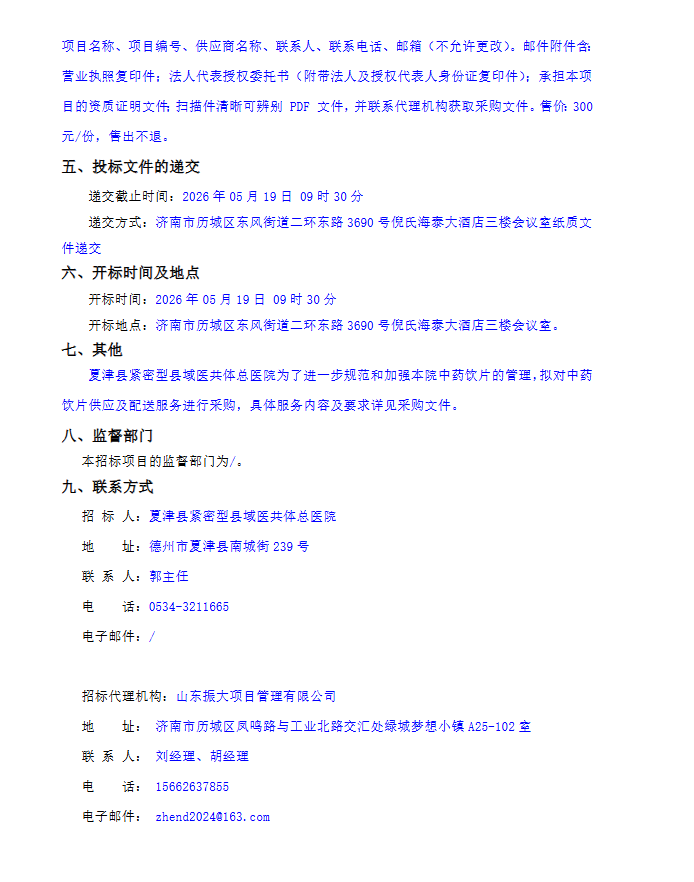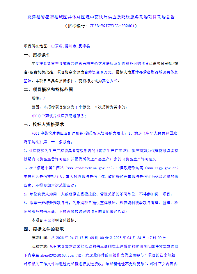 山东省夏津县紧密型县域医共体总医院中药饮片供应及配送服务采购项目采购公告