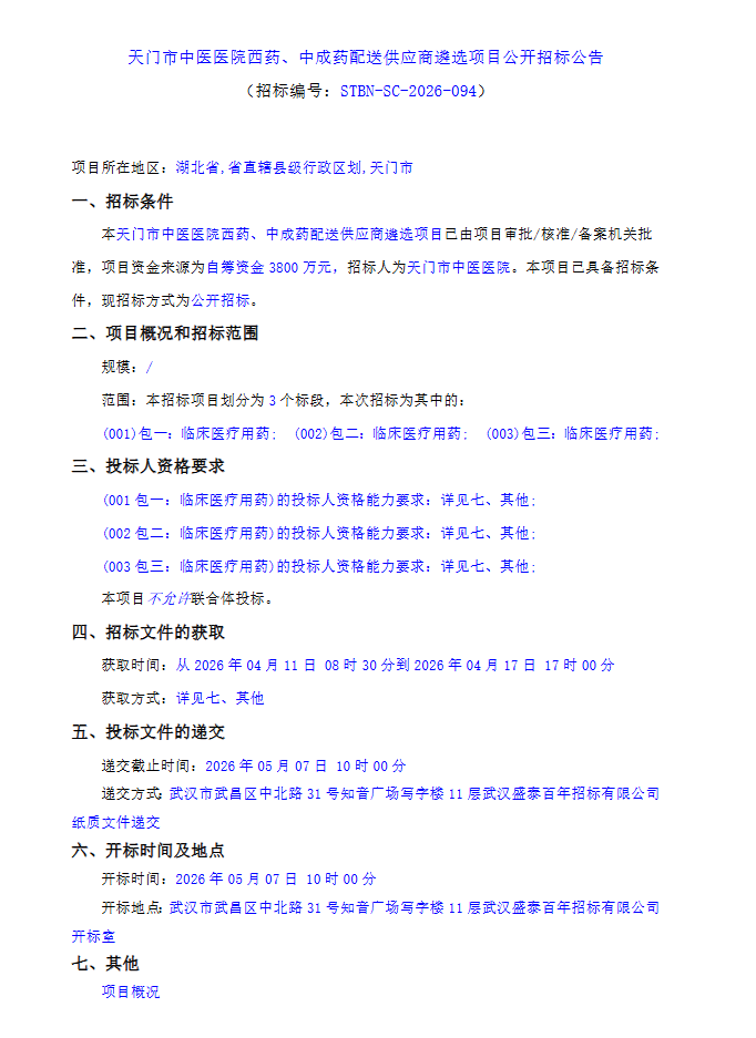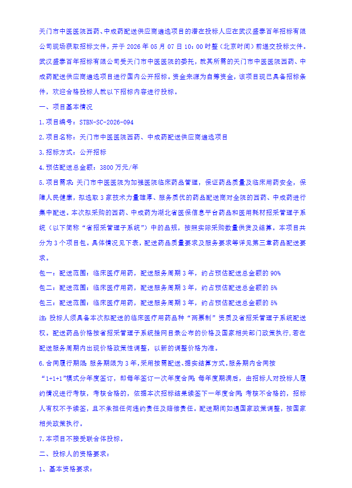 湖北省天门市中医医院西药、中成药配送供应商遴选项目公开招标公告