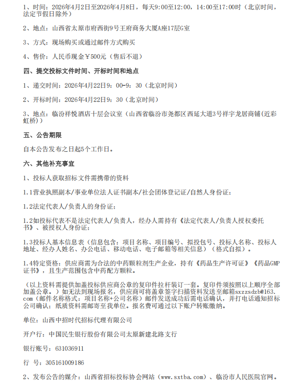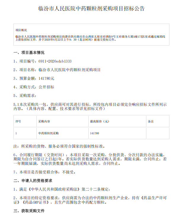 山西省临汾市人民医院中药颗粒剂采购项目招标公告