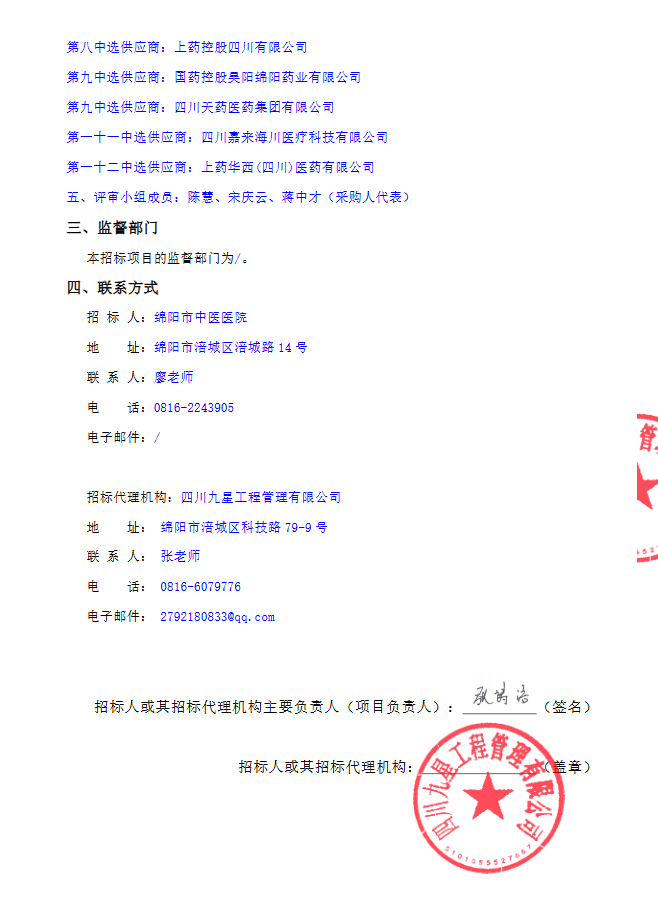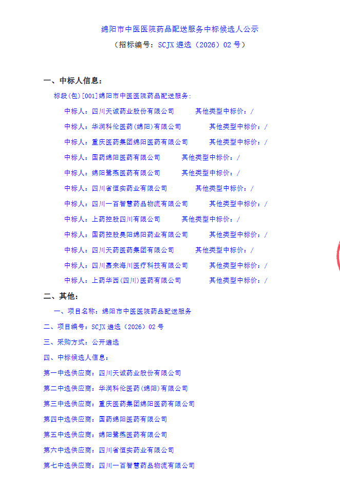 四川省绵阳市中医医院药品配送服务中标候选人公示