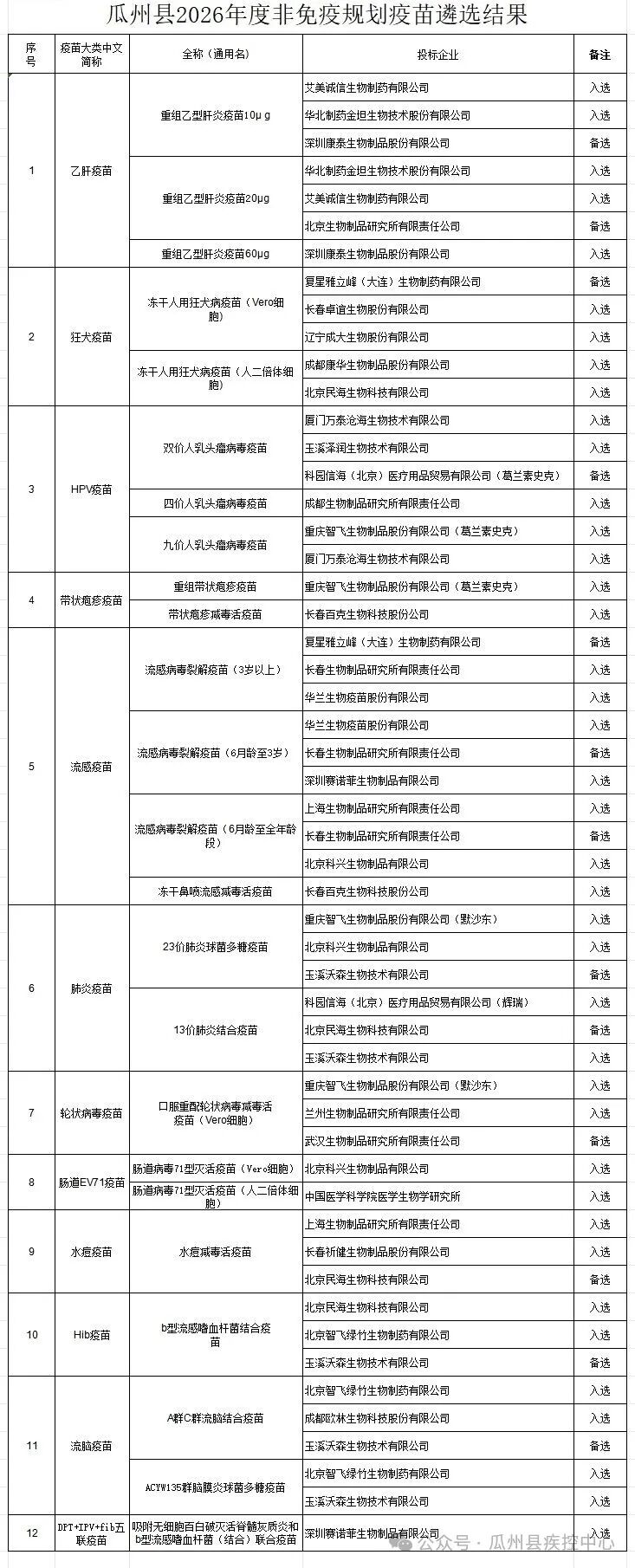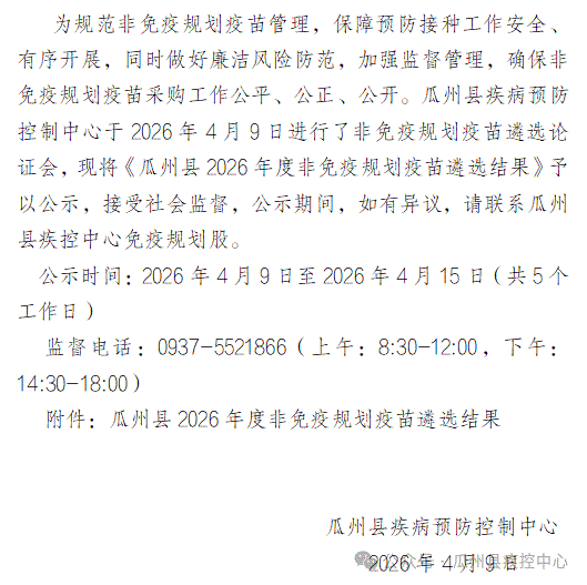 瓜州县2026年度非免疫规划疫苗遴选结果公示