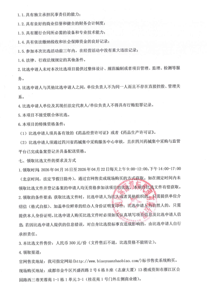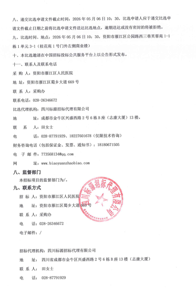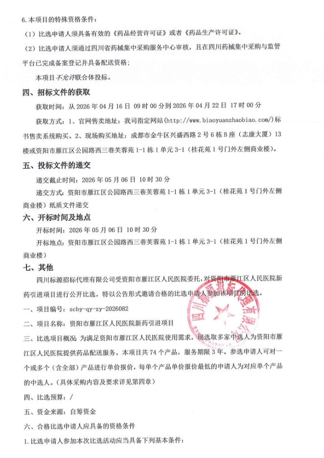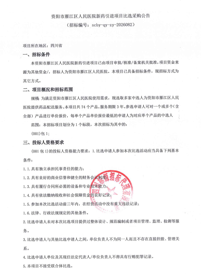 四川省资阳市雁江区人民医院新药引进项目比选采购公告
