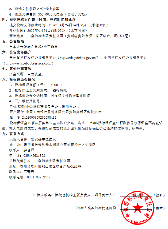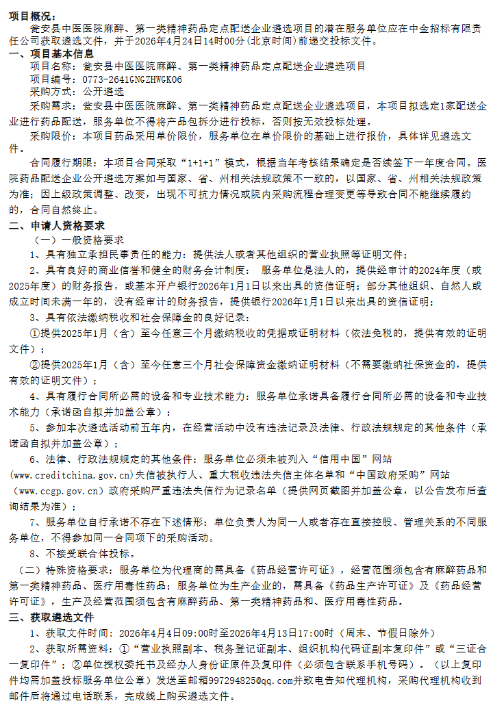 贵州省黔南布依族苗族自治州瓮安县中医医院麻醉、第一类精神药品定点配送企业遴选项目遴选公告