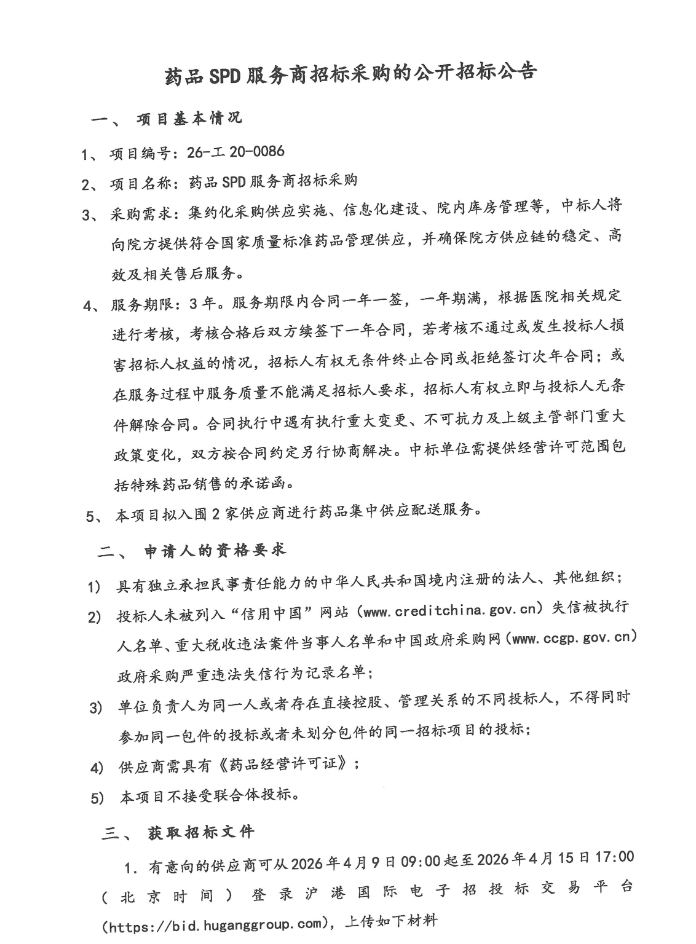 上海市杨浦区中心医院药品SPD服务商招标采购-公开招标公告