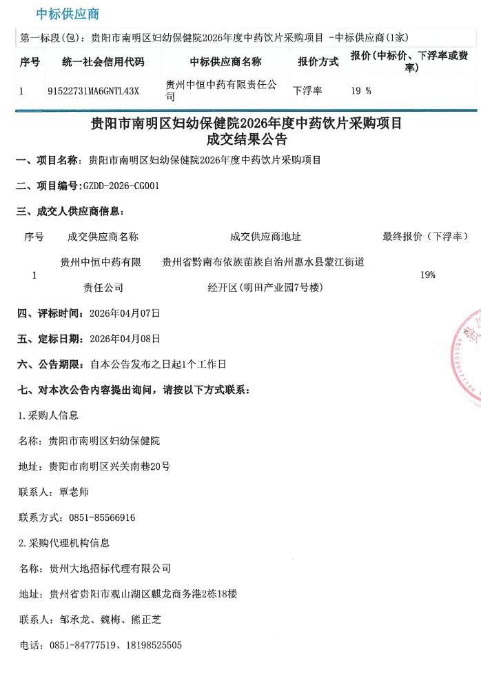 贵州省贵阳市南明区妇幼保健院2026年度中药饮片采购项目成交结果公告