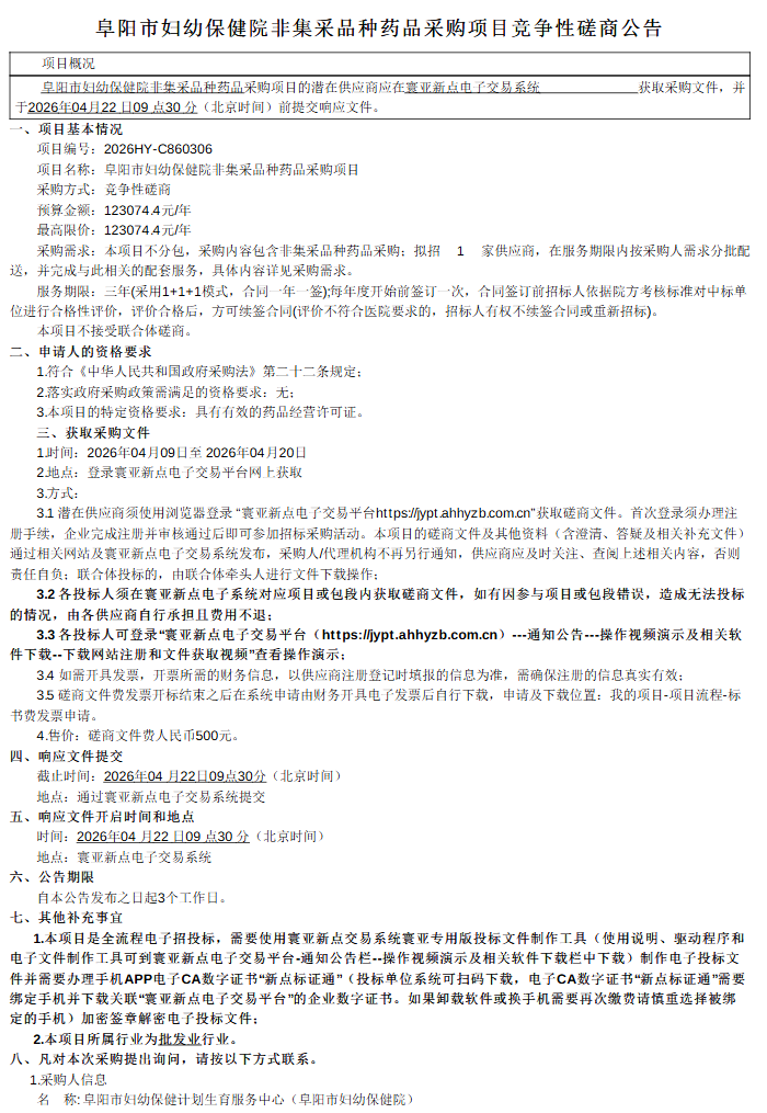 安徽省阜阳市妇幼保健院非集采品种药品采购项目竞争性磋商公告
