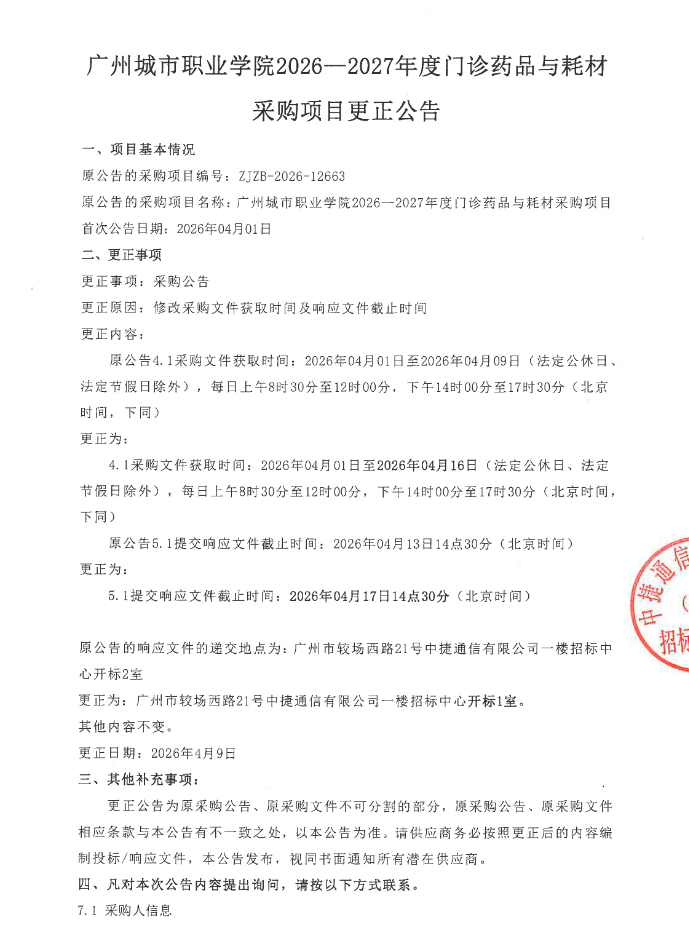 广东省广州城市职业学院2026—2027年度门诊药品与耗材采购项目更正公告