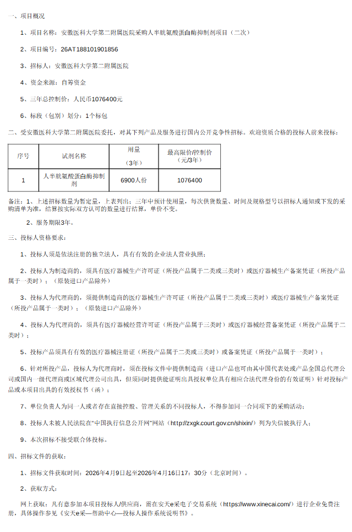安徽医科大学第二附属医院采购人半胱氨酸蛋白酶抑制剂项目(二次)招标公告
