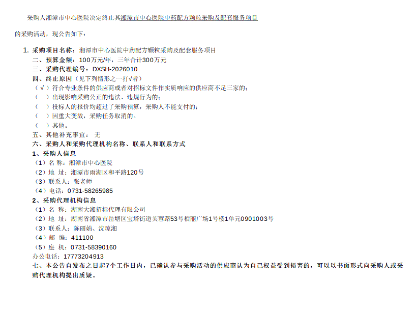 湖南省湘潭市中心医院中药配方颗粒采购及配套服务项目终止公告