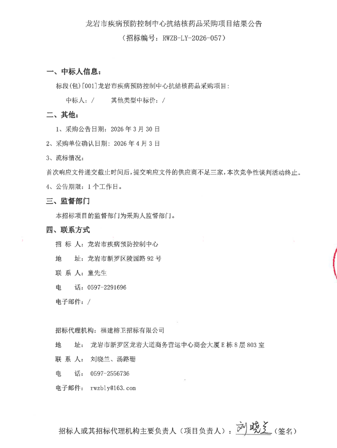 福建省龙岩市疾病预防控制中心抗结核药品采购项目结果公告