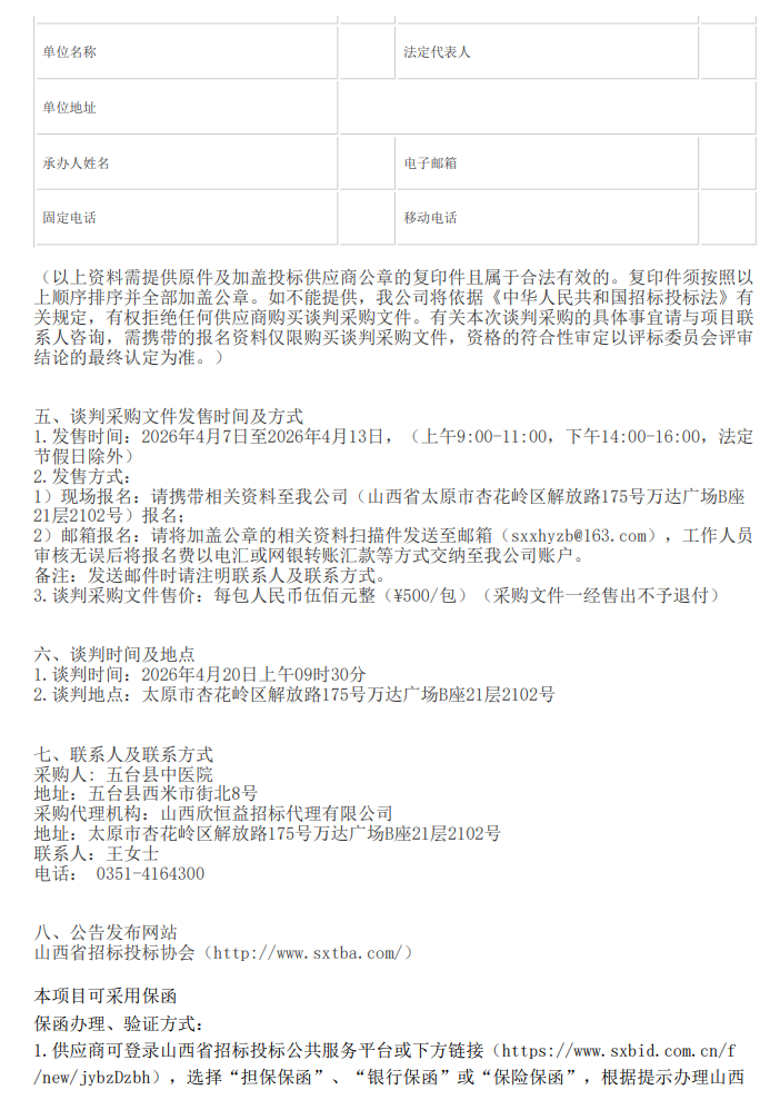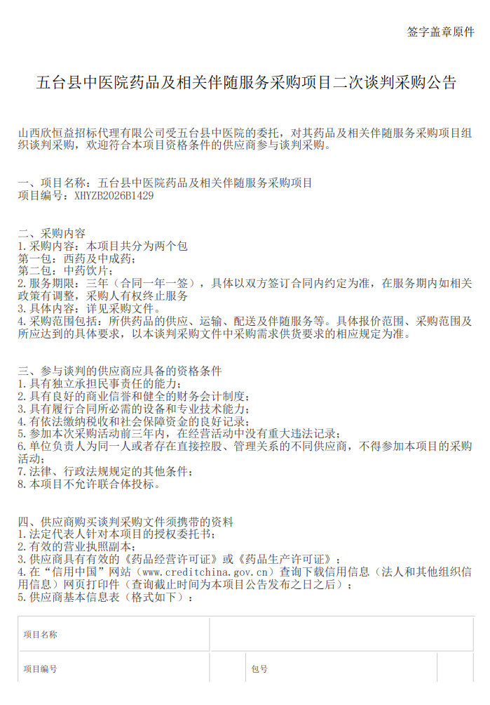 山西省忻州市五台县中医院药品及相关伴随服务采购项目二次谈判采购公告
