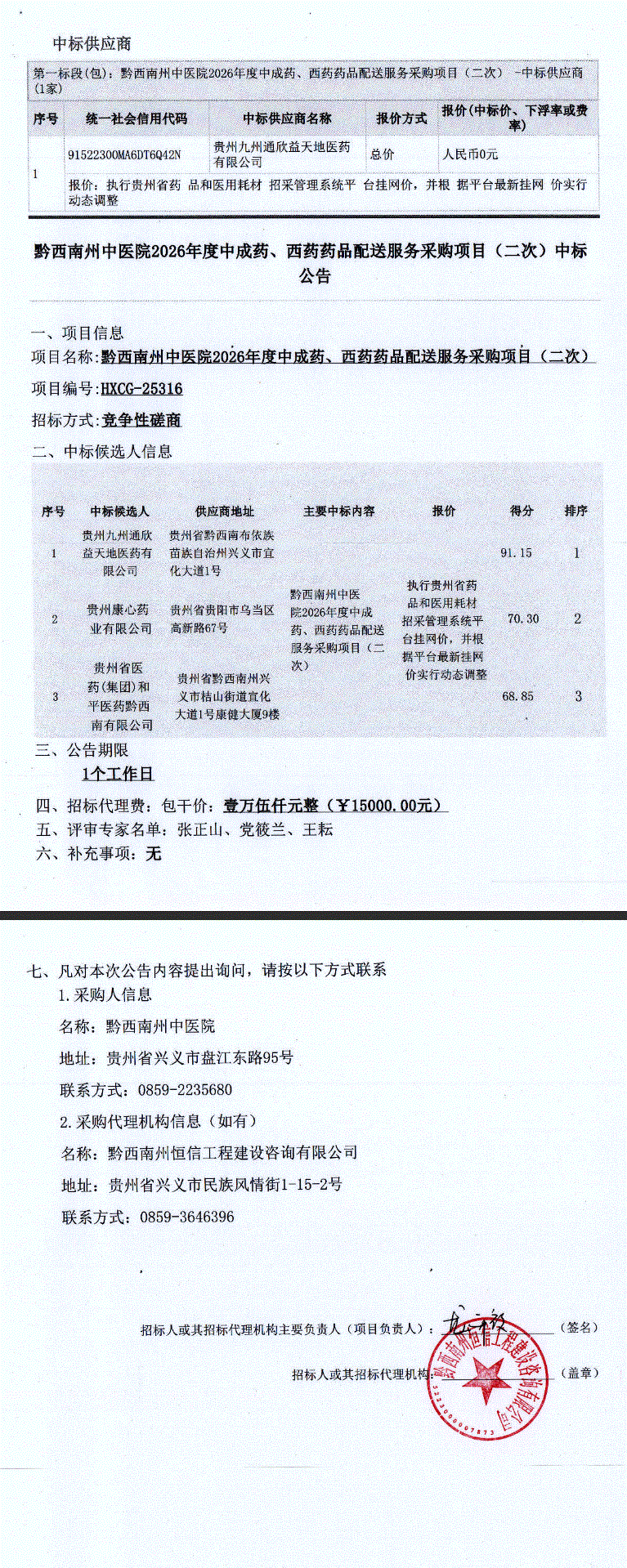 贵州省黔西南州中医院2026年度中成药、西药药品配送服务采购项目(二次)中标公告
