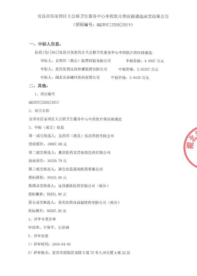 湖北省宜昌市伍家岗区大公桥卫生服务中心中药饮片供应商遴选成交结果公告