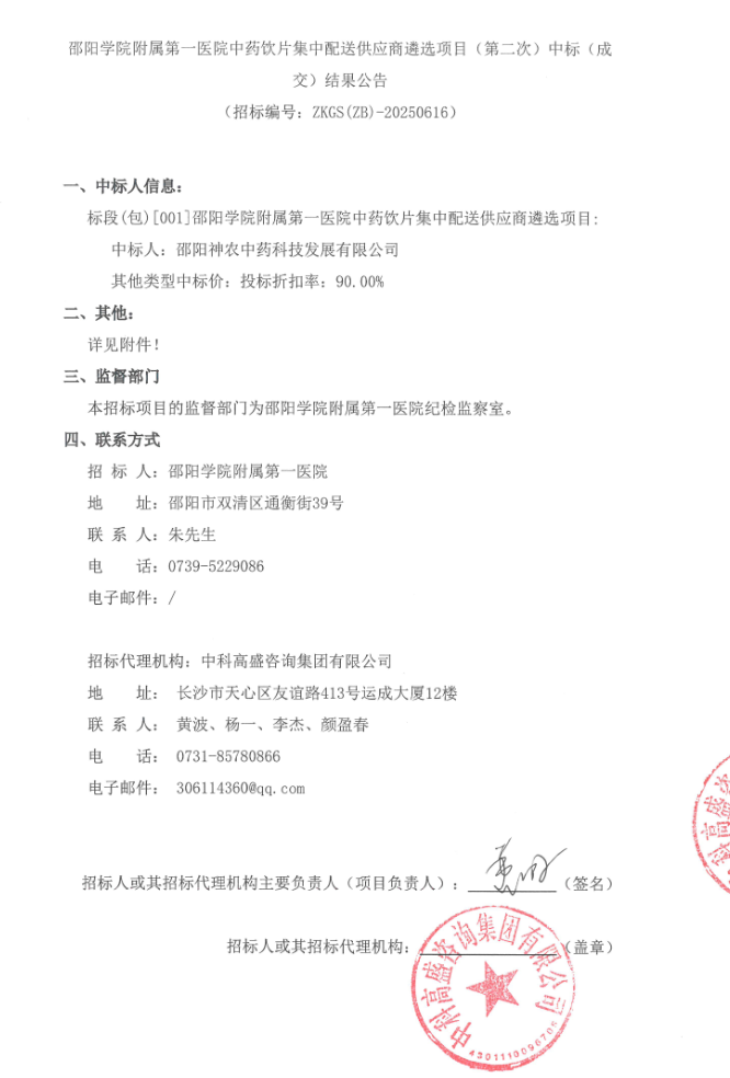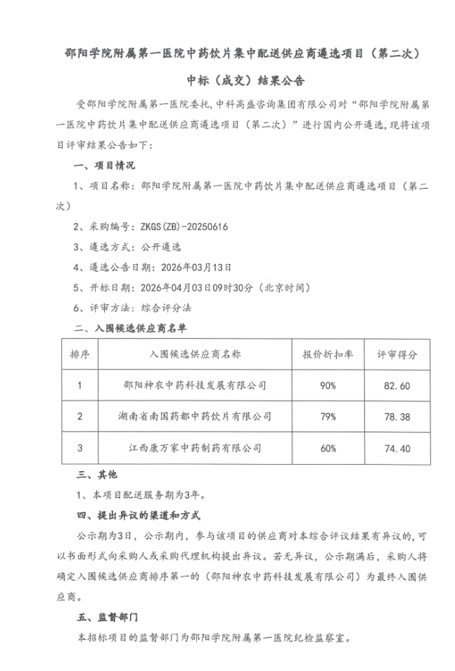 湖南省邵阳学院附属第一医院中药饮片集中配送供应商遴选项目(第二次)中标(成交)结果公告