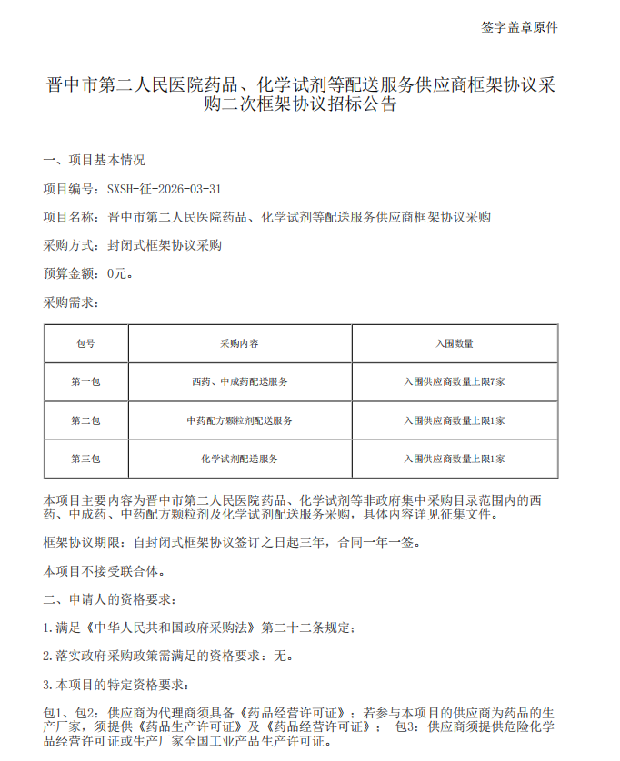 山西省晋中市第二人民医院药品、化学试剂等配送服务供应商框架协议采购二次框架协议招标公告