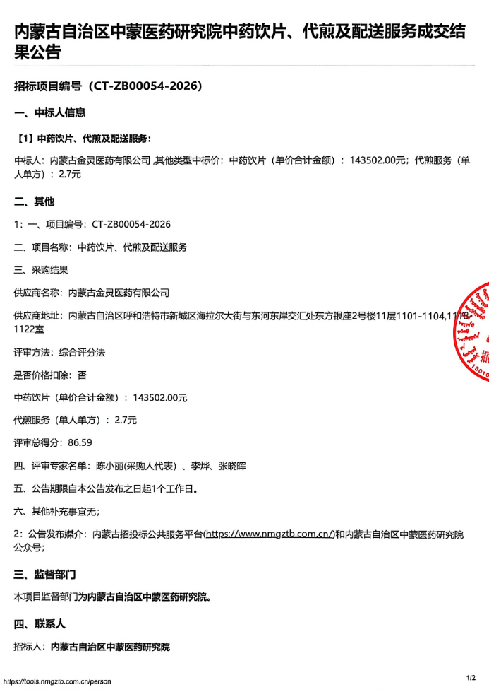 内蒙古自治区中蒙医药研究院中药饮片、代煎及配送服务成交结果公告