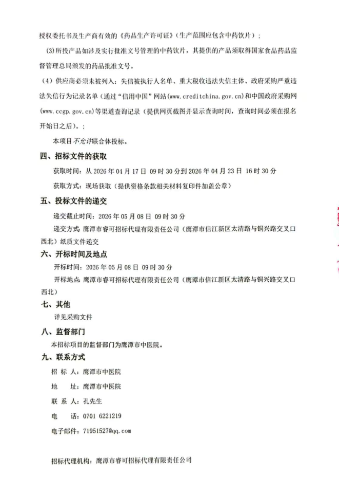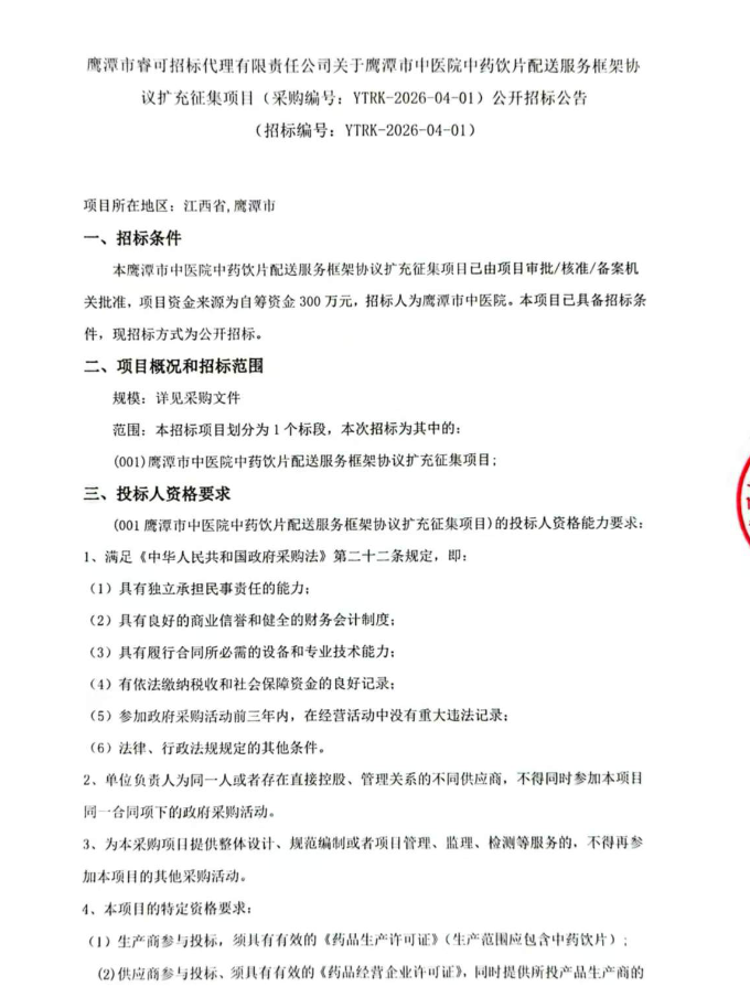 江西省鹰潭市睿可招标代理有限责任公司关于鹰潭市中医院中药饮片配送服务框架协议扩充征集项目(采购编号:YTRK-2026-04-01)公开招标公告