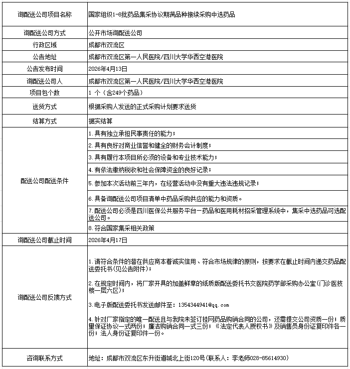四川省成都市双流区第一人民医院关于国家组织1-8批药品集采协议期满品种接续采购中选药品的询配送公司公告