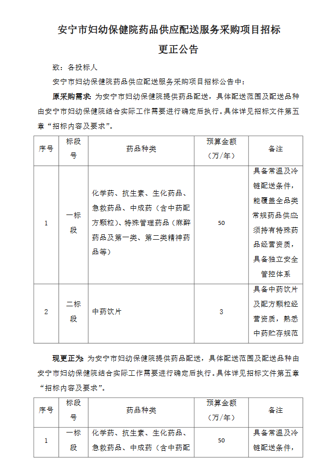 云南省昆明市安宁市妇幼保健院药品供应配送服务采购项目更正公告