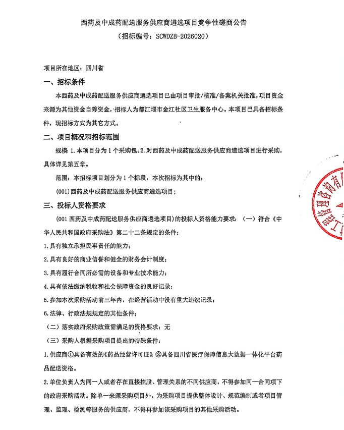 四川省都江堰市金江社区卫生服务中心西药及中成药配送服务供应商遴选项目竞争性磋商公告
